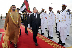 Above image - "Chinese Premier Wen Jiabao (C) is welcomed by Vice President and Prime Minister of the United Arab Emirates (UAE) Sheikh Mohammed bin Rashid Al-Maktoum (L) after arriving in Abu Dhabi, Jan. 16, 2012.